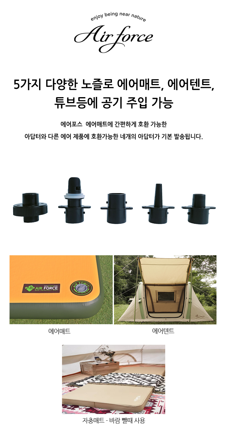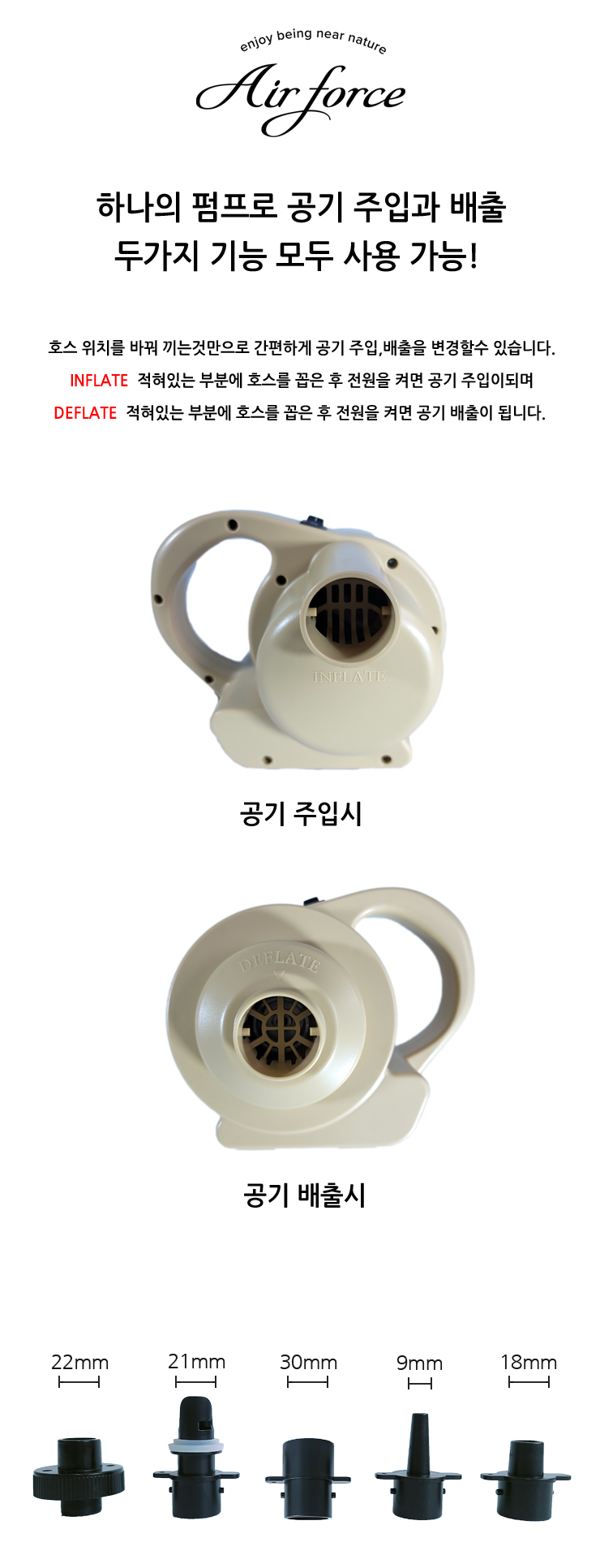 에어매트 공기 주입/배출을 편리하게 할 수 있는 전동펌프입니다.